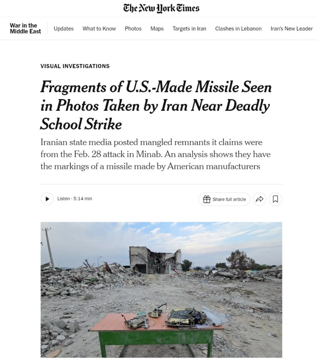 Остатки американской крылатой ракеты BGM-109 Tomahawk 2014 года выпуска обнаружены около школы в Минабе, где в результате удара 28 февраля погибли более 170 детей — The New York Times.