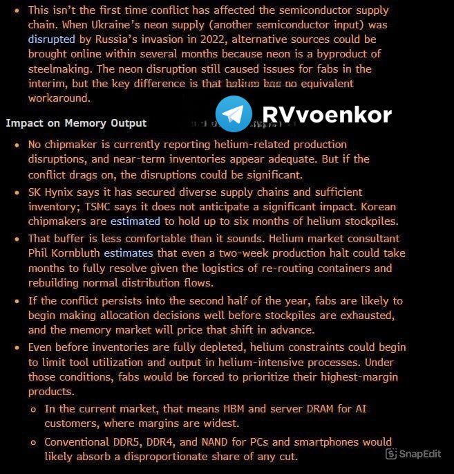 гелий не имеет жизнеспособной замены в процессе производства чипов. Заменить поставки Катара пока никто не может. Контейнеры с гелием стоят застрявшими на Ближнем Востоке;
