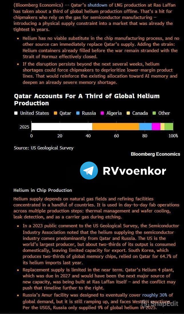 из-за того, что Катар закрыл производство СПГ, около трети мирового производства гелия было остановлено. Это затронуло производителей чипов, которые полагаются на гелий для производства полупроводников;