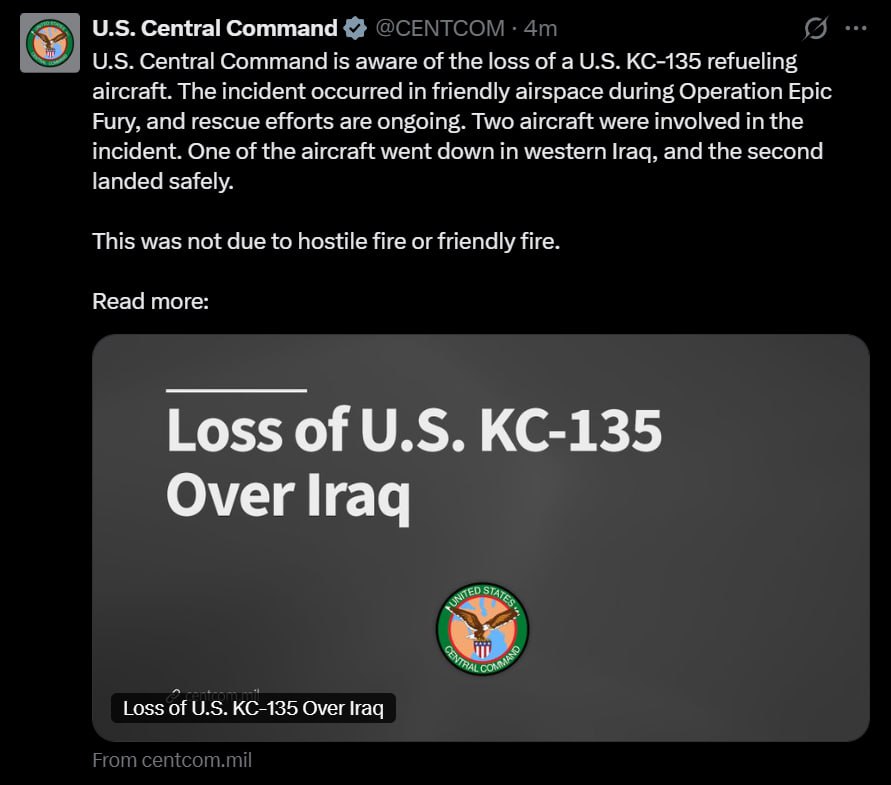 В ходе операции "Эпическая ярость" потерян самолет-заправщик Stratotanker KC-135 ВВС США