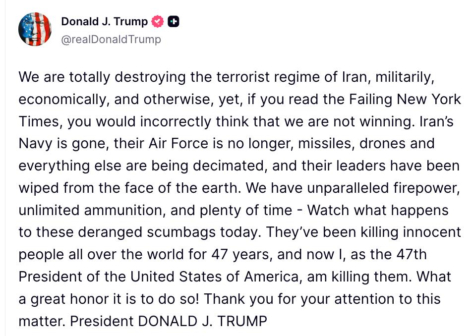 По его словам, иранские военно-морские силы «уничтожены», военно-воздушные силы «больше не существуют», а ракеты и беспилотники страны подвергаются «тотальному уничтожению».