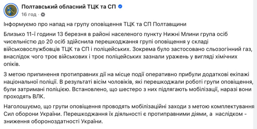 Группа из 20 человек напала на ТЦКшников и полицейских, – сообщает Территориальный центр комплектования и мобилизации Полтавской области.