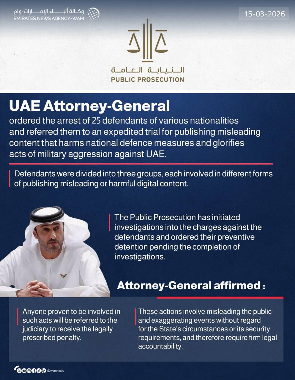 Власти ОАЭ объявили о задержании 25 человек по обвинениям в восхвалении Ирана и его лидеров, пропаганде военных действий Исламской Республики и распространении "определённых видео". Некоторые из этих задержанных являются гражданами Индии, Пакистана, Непала и Египта.
