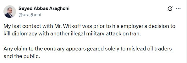 «Мой последний контакт с господином Уиткоффом состоялся до того, как его «работодатель» принял решение покончить с дипломатией, нанеся очередной незаконный военный удар по Ирану. Любые утверждения об обратном, по всей видимости, направлены исключительно на то, чтобы ввести в заблуждение нефтетрейдеров и общественность», – написал Аббас Аракчи.