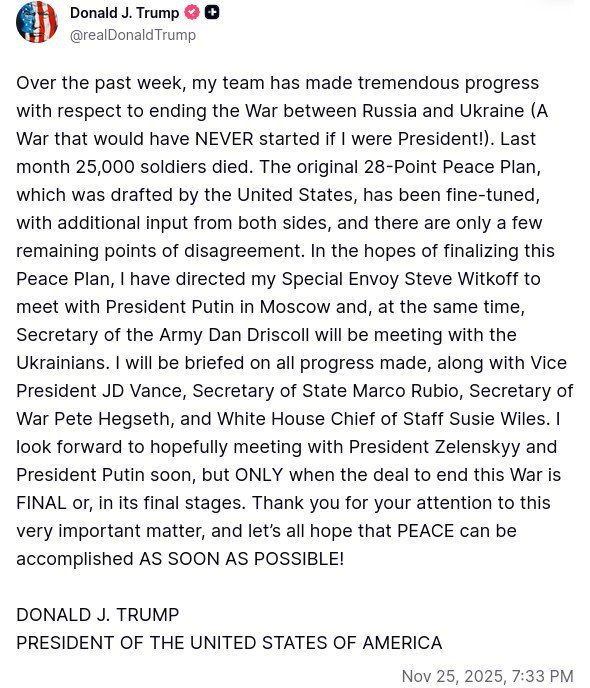 Я поручил Уиткоффу встретиться в Москве с Путиным,- Трамп"Я с нетерпением жду встречи с президентом Зеленским и президентом Путиным в ближайшее время, но только когда соглашение о прекращении этой войны будет окончательно или находиться на завершающей...