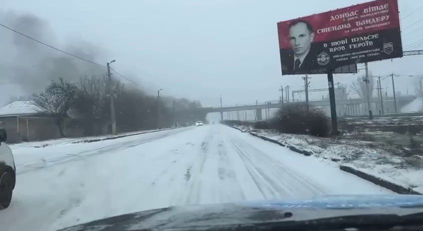 Кадр из освобожденной несколько дней назад Дружковки: плакат с изображением нациста Бандеры и надписью: "Донбасс поздравляет Степана Бандеру с днем рождения".@ukr_leaks