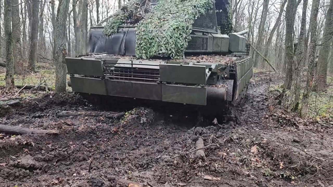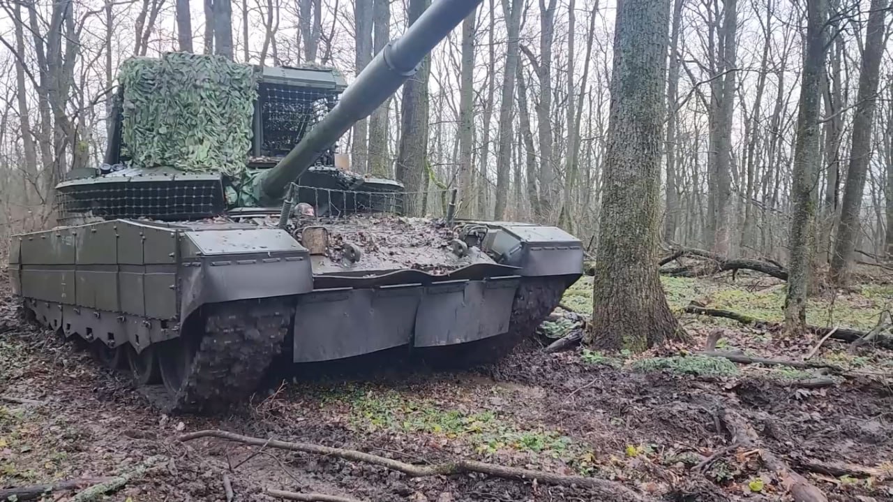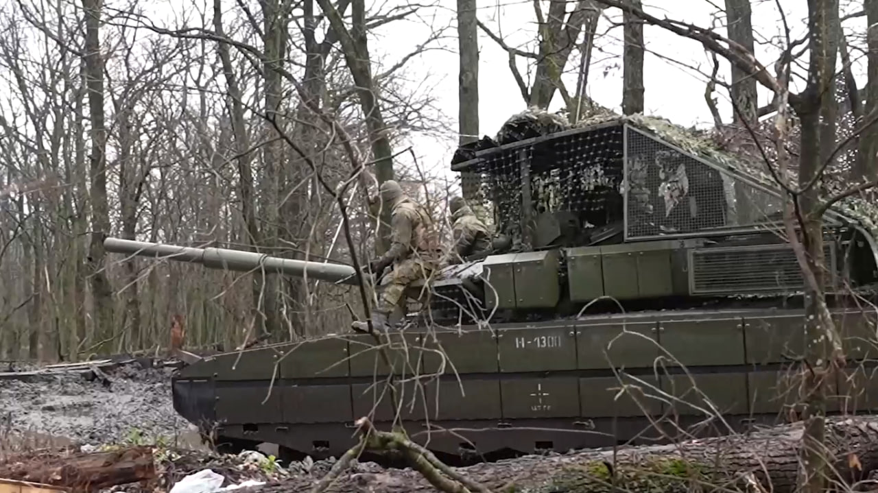 Российский танк Т-80БВМ, в заводском комплекте дополнительной защиты, из состава 44-го АК ГрВ "Север" во взаимодействии с расчётами войск БпС поразил позиции ВСУ в Харьковской области, сообщает Минобороны РФ.