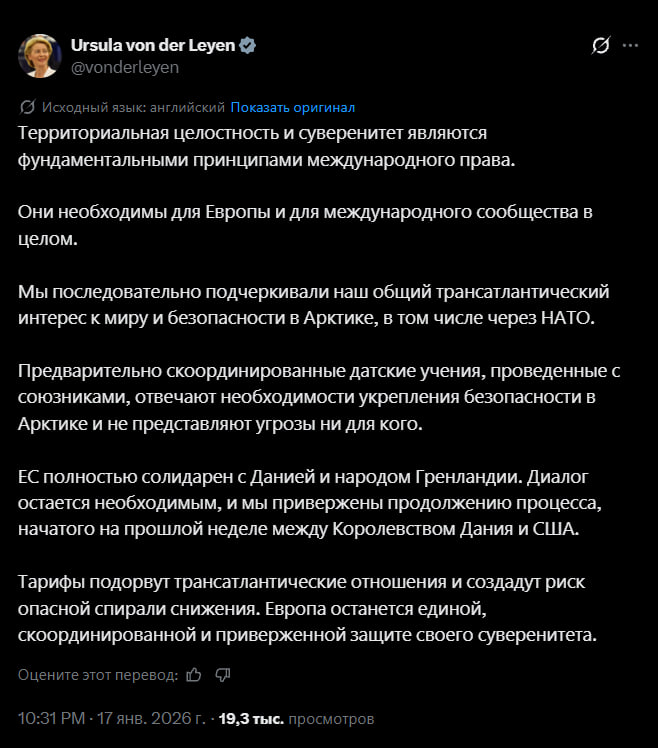 Урсула недовольна угрозами Трампа ввести пошлины до тех пор, пока ему не продадут Гренландию.