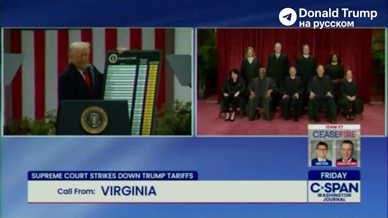 В эфир телеканала C-SPAN позвонил мужчина с голосом, похожим на Дональда Трампа, и представился «Джоном Барроном», республиканцем из Вирджинии. В разговоре он резко раскритиковал решение Верховного суда о приостановке тарифов и назвал его худшим решением.