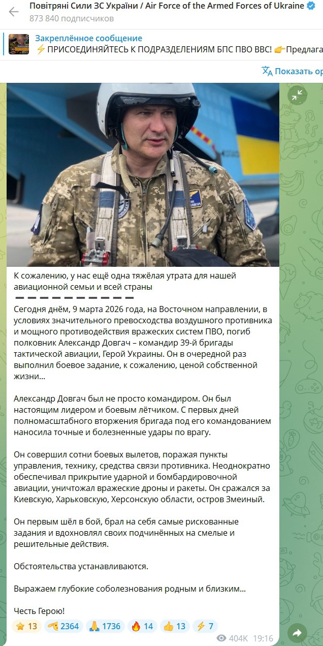Сегодня на Восточном направлении погиб лётчик Александр Довгач, командир 39-й бригады тактической авиации, Герой Украины. Он выполнял боевую задачу, — заявляют Воздушные силы ВСУ.Полковник Довгач погиб 9 марта "в условиях значительного превосходства...