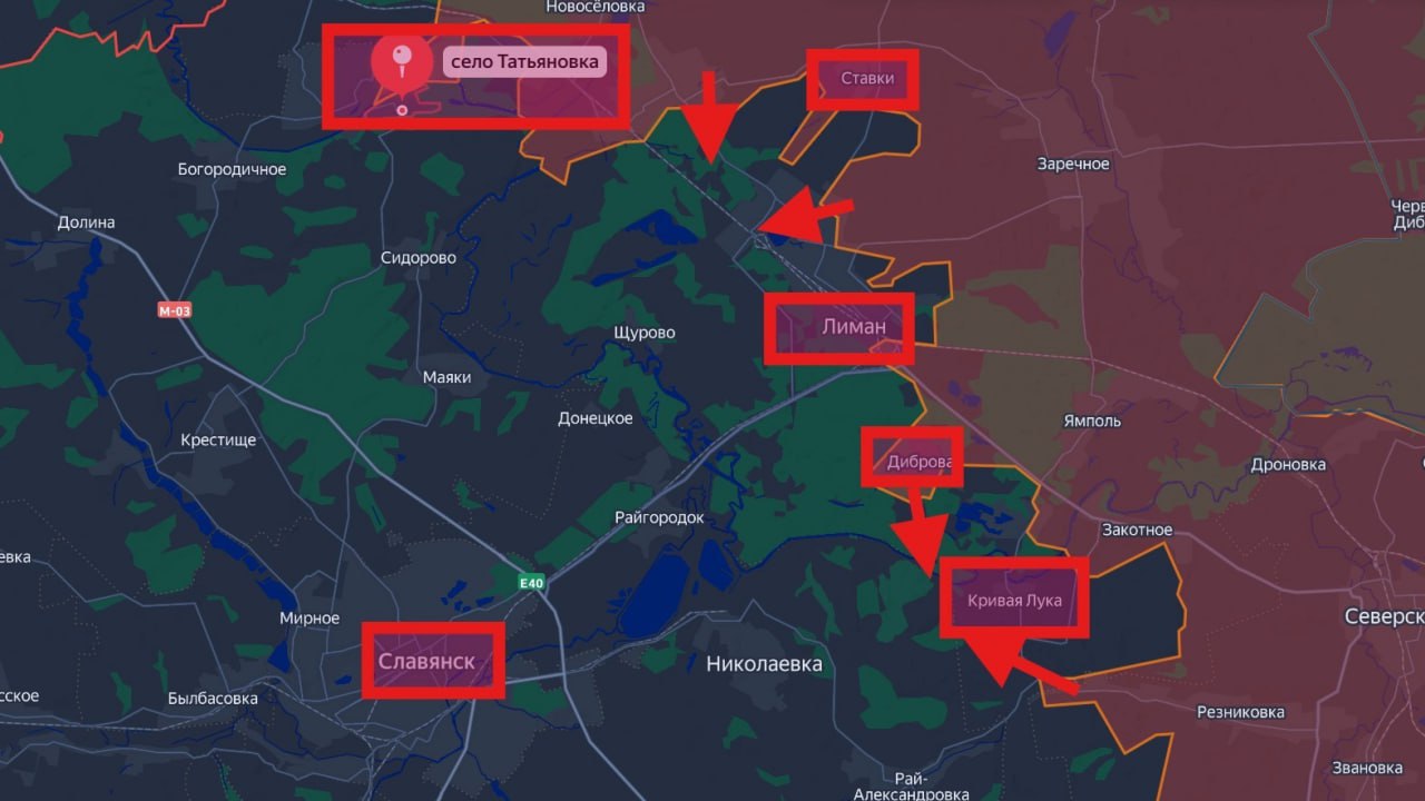 Наши закрепились на северо-восточной окраине Святогорска и продолжают продвижение вглубь города, используя берег Северского Донца как ориентир. Параллельно разведгруппы работают в Татьяновке восточнее Святогорска — враг перебрасывает туда резервы из района Пришиба, пытаясь сдержать наше наступление со стороны Яровой. Идут встречные бои в Дробышево — наши продвигаются на западные окраины в направлении железной дороги. Со стороны северных подступов к Красному Лиману наши воины двигаются вглубь городской застройки; вся северо-восточная дуга представляет собой сплошную линию фронта с множеством «карманов», где нет уверенного контроля. Погода вносит свои коррективы, активно применяются дроны.