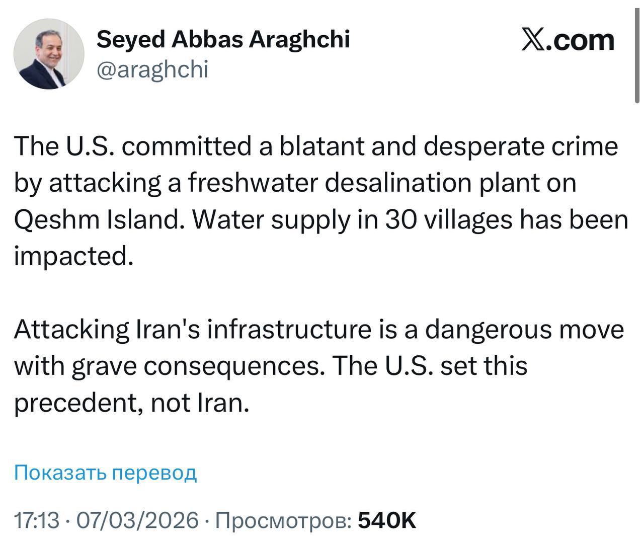 МИД Ирана обвинил США в атаке на завод по опреснению воды на юге страны. Об этом заявил министр иностранных дел Ирана Аббас Аракчи.