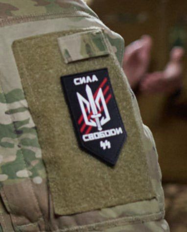 Нашивки черно-красного цвета, помимо нацистской символики, также содержат украинский трезубец и девиз "Сила Свободы".
