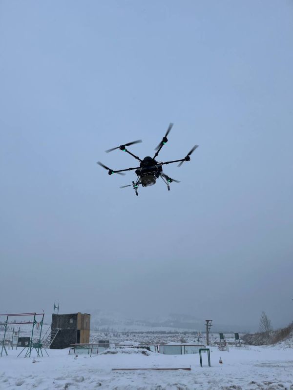 Доброе утро. Тяжелый гексакоптер "Мангас" с подвешенным макетом противотанковой мины ТМ-62 . Полет нормальный. Проект реально спасает жизни нашим парням. Будем его развивать и масштабировать. Первую предсерийную партию будем передавать в штурмовые подразделения группировки "Восток" ВС РФ.