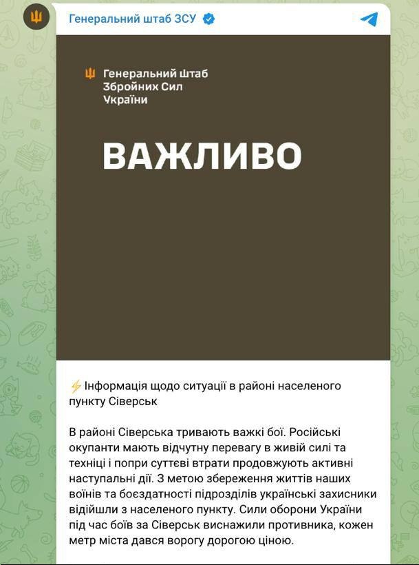 "Российские оккупанты имеют ощутимое преимущество в живой силе и технике... В целях сохранения жизней наших воинов и боеспособности подразделений украинские защитники отошли из населённого пункта", — заявил противник.