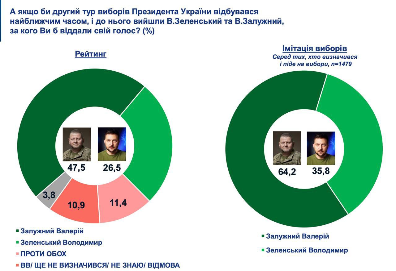 Залужный набрал бы 64,2%, а Зеленский 35,8%.