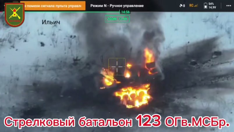Дроноводы 123-й мотострелковой бригады несколькими дронами уничтожили БМП-2 хохлов в районе Северска. После экипаж в составе 3 человек бежал в ближайший подвал, где их тоже накрыли.