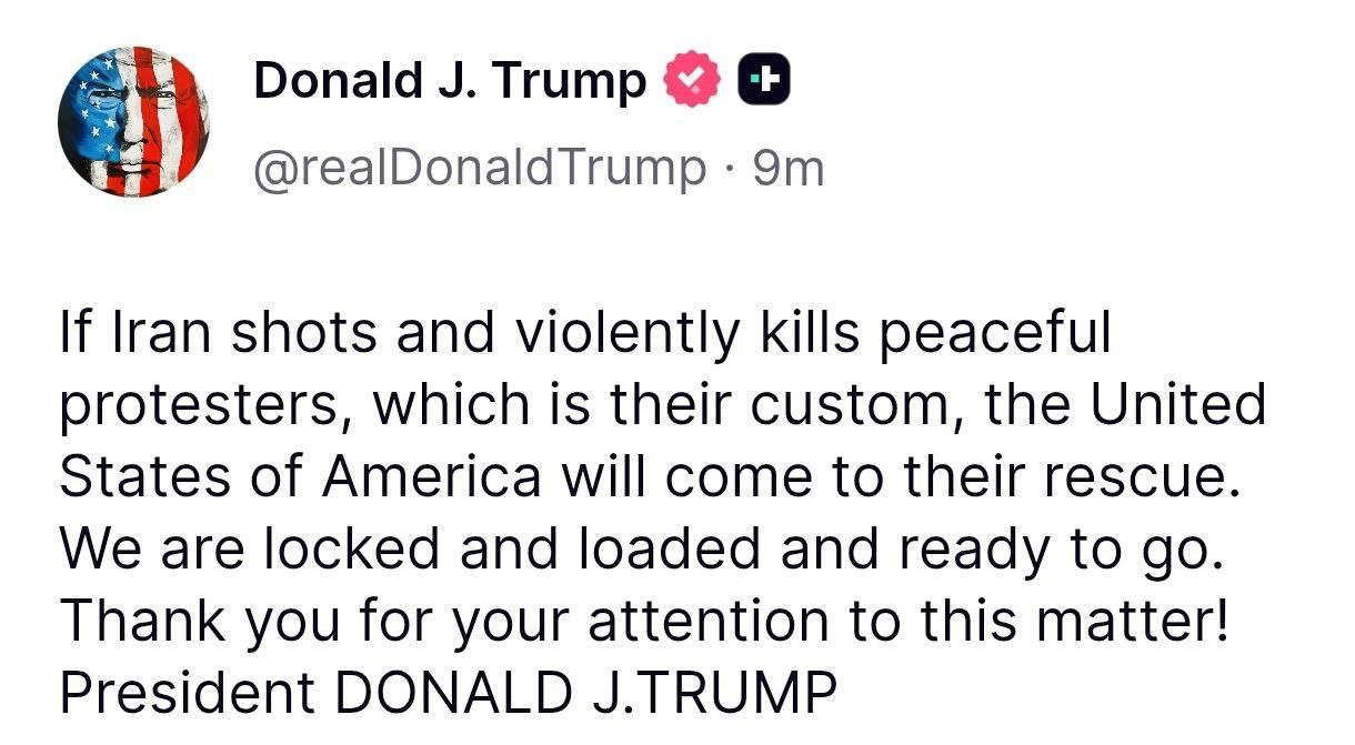 Президент США в своей социальной сети в резкой публикации заявил, что США находятся в «полной боевой готовности» и готовы оказать военную помощь протестующим, если власти страны будут применять силу для разгона акций. Протесты в Иране вспыхнули на...