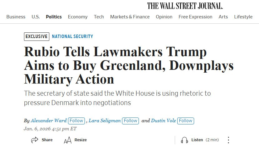 Госсекретарь Марко Рубио заявил законодателям, что недавние угрозы администрации в адрес Гренландии не означают неминуемого вторжения и что цель состоит в том, чтобы выкупить остров у Дании, по словам людей, знакомых с ходом обсуждений.Заявления Рубио, сделанные в понедельник во время закрытого брифинга, прозвучали на фоне всё более воинственных заявлений Белого дома о контроле над островом. Президент Трамп и высокопоставленные чиновники администрации публично отказались исключить возможность захвата территории силой.