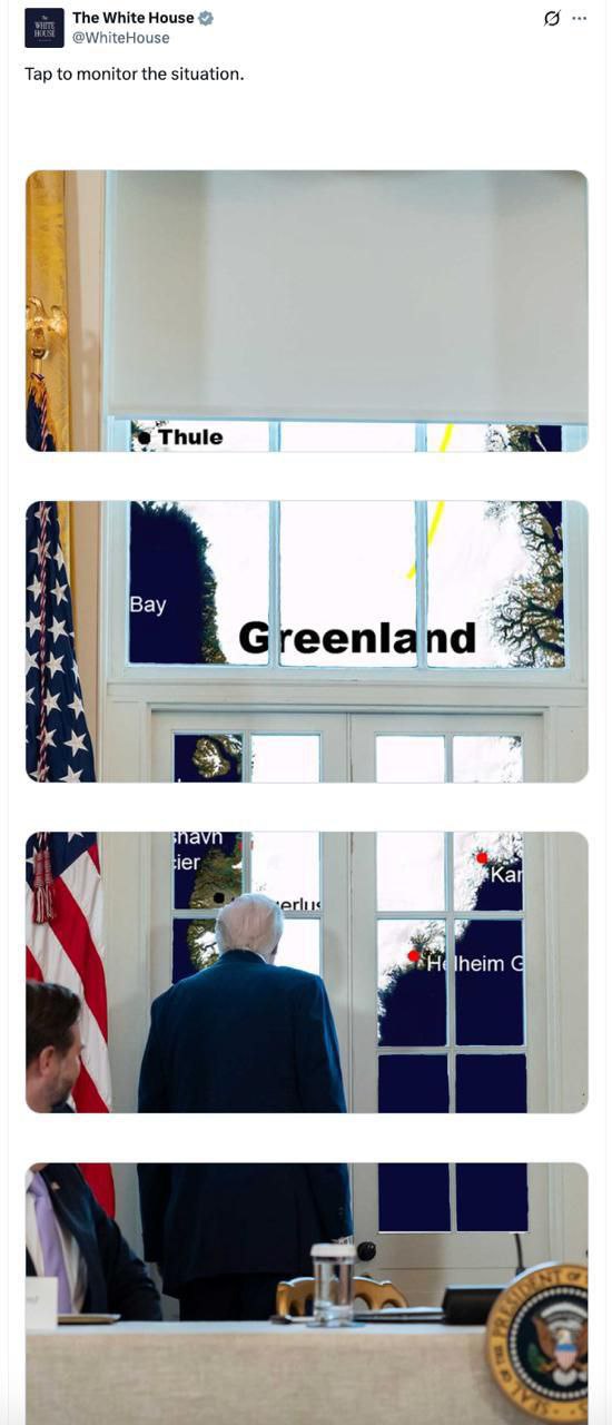Белый дом опубликовал в фото Трампа на фоне карты Гренландии и предложил следить за развитием ситуации.