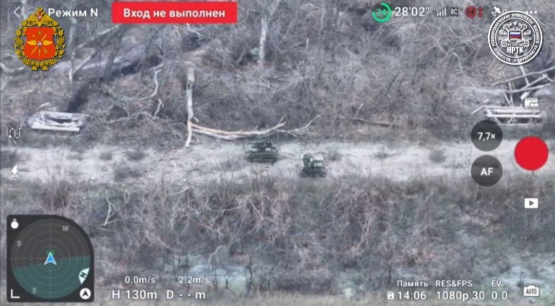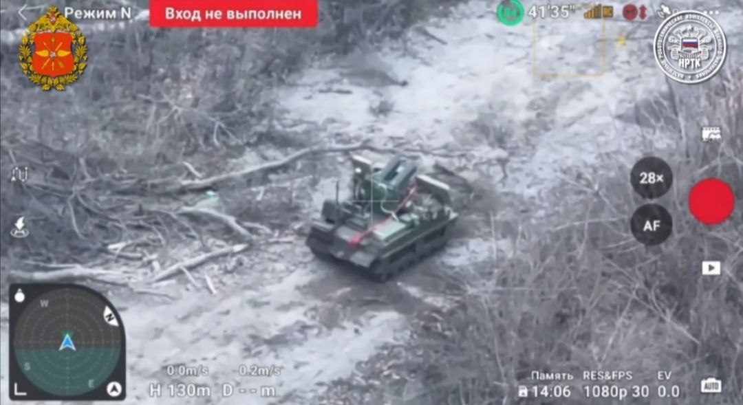 Два НРТК "Курьер" атакуют украинские позиции - первый вооружён 12,7 пулемётом НСВТ, а второй выступает прикрытием с РЭБ.