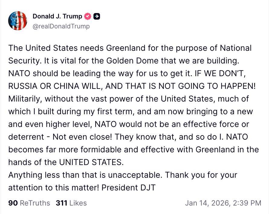 США необходима Гренландия для национальной безопасности. Она жизненно важна для "Золотого купола", который мы строим.НАТО должно проложить нам путь к ее получению. ЕСЛИ МЫ ЭТОГО НЕ СДЕЛАЕМ, ЭТО СДЕЛАЮТ РОССИЯ ИЛИ КИТАЙ, И ЭТО НЕДОПУСТИМО!В военном...