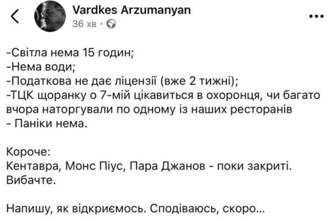 Во Львове тоже все очень плохо со светом и теплом. Закрываются многие рестораны.