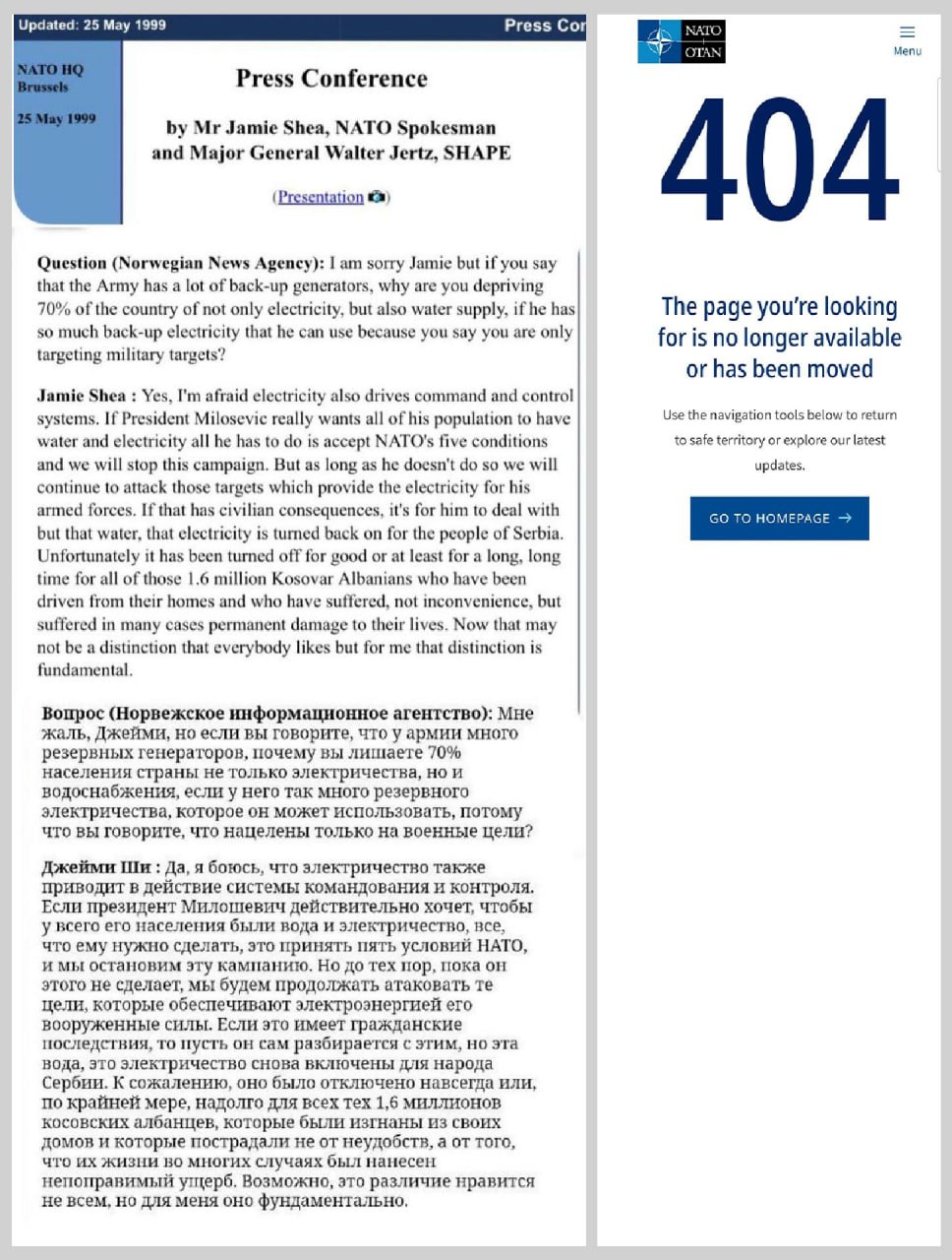 "НАТО будет и дальше атаковать энергообъекты Сербии. Если это наносит вред гражданским, лишая их воды и электричества – это проблемы Милошевича. Пусть примет 5 условий НАТО и это прекратится", – говорится во "внезапно" исчезнувшем материале брифинга официального представителя НАТО Джейми Ши от 25 мая 1999 года.
