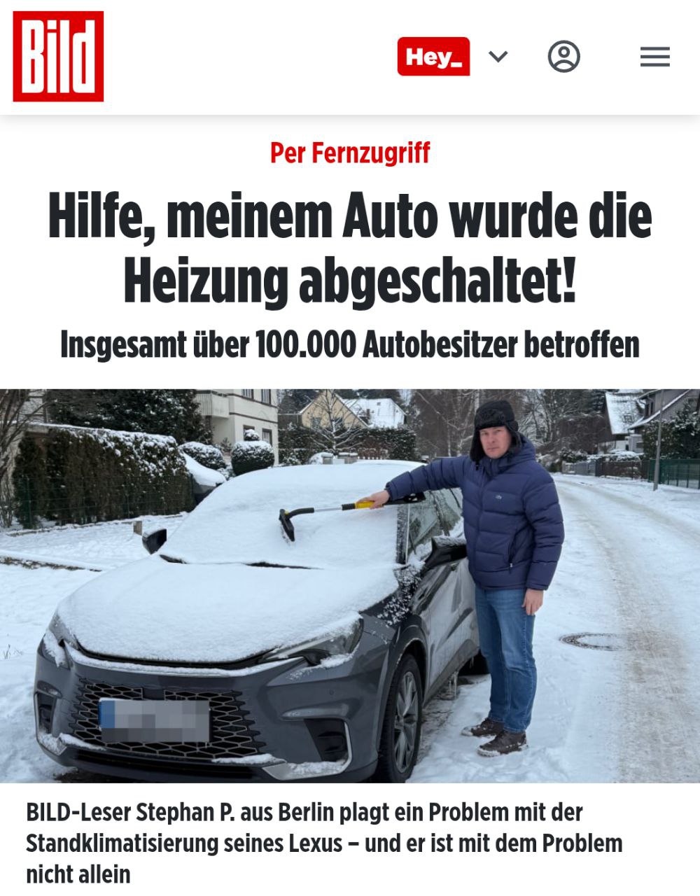"Читатель BILD Стефан П. (44) из Берлина не мог поверить своим глазам, когда открыл приложение для своего автомобиля в 7:12 утра 8 декабря: служба поддержки клиентов Lexus сообщила владельцу автомобиля, что удаленный доступ к дополнительному климат-контролю его автомобиля был отключен. Эта удобная функция больше не может поддерживаться в связи с текущей правовой ситуацией"