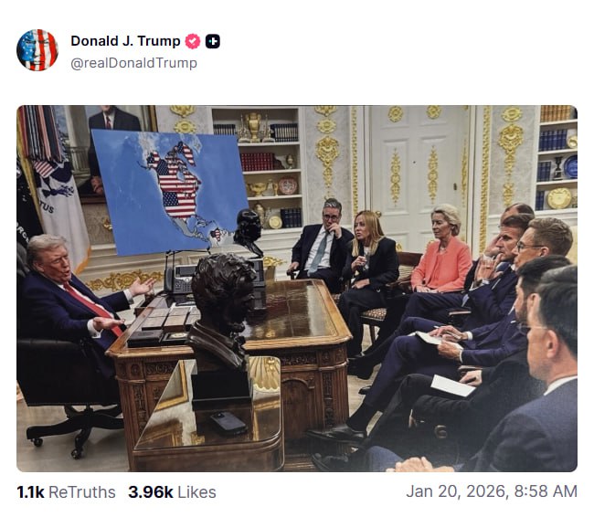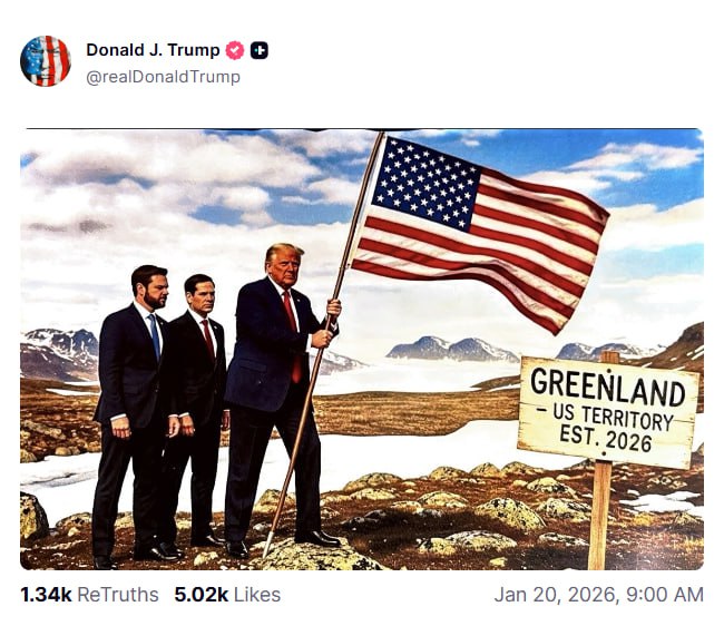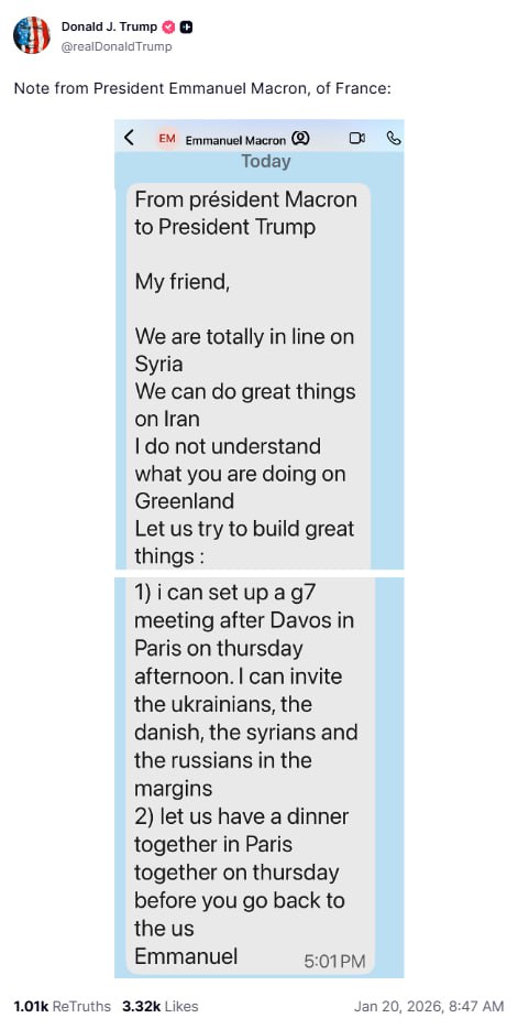 Президент США опубликовал в своей соцсети якобы сообщение от Макрона, где тот недоумевает действиями Трампа по поводу Гренландии. Затем он запостил 2 изображения — на первом изображено присоединение Гренландии к США в 2026 году, а на втором Канада и Венесуэла также окрашены в американский флаг на карте.