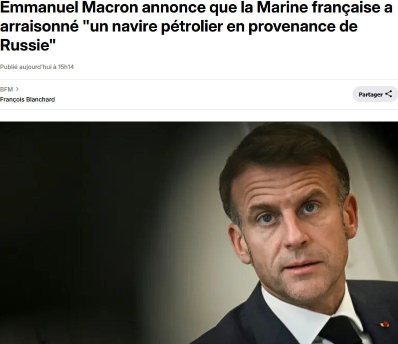 Сегодня французский флот задержал танкер, который связывают с российским теневым флотом. Видимо, галлы вдохновлялись славой алжирских пиратов. Надеюсь, что Макрона ждет судьба африканских флибустьеров.Александр Харченко