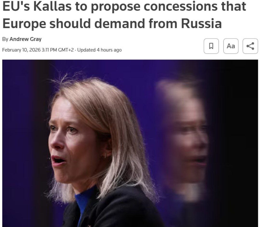 Как сообщает Reuters, главный дипломат ЕС Кая Каллас заявила, что подготовила перечень уступок, которые Европа будет требовать от России в ходе мирных переговоров. Среди прочего, это ограничение численности армии. При том, что Европу даже не допустили до российско-украинских переговоров в Абу-Даби.
