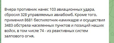 Генштаб хохлов сообщает, что позавчера русские бомбардировщики сбросили 328 ФАБ УМПК в ходе 103 ударов, что делает это новым рекордом.