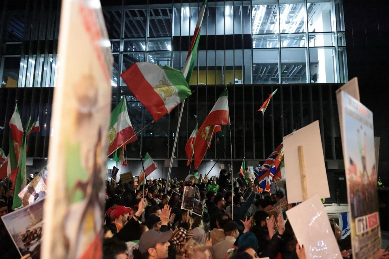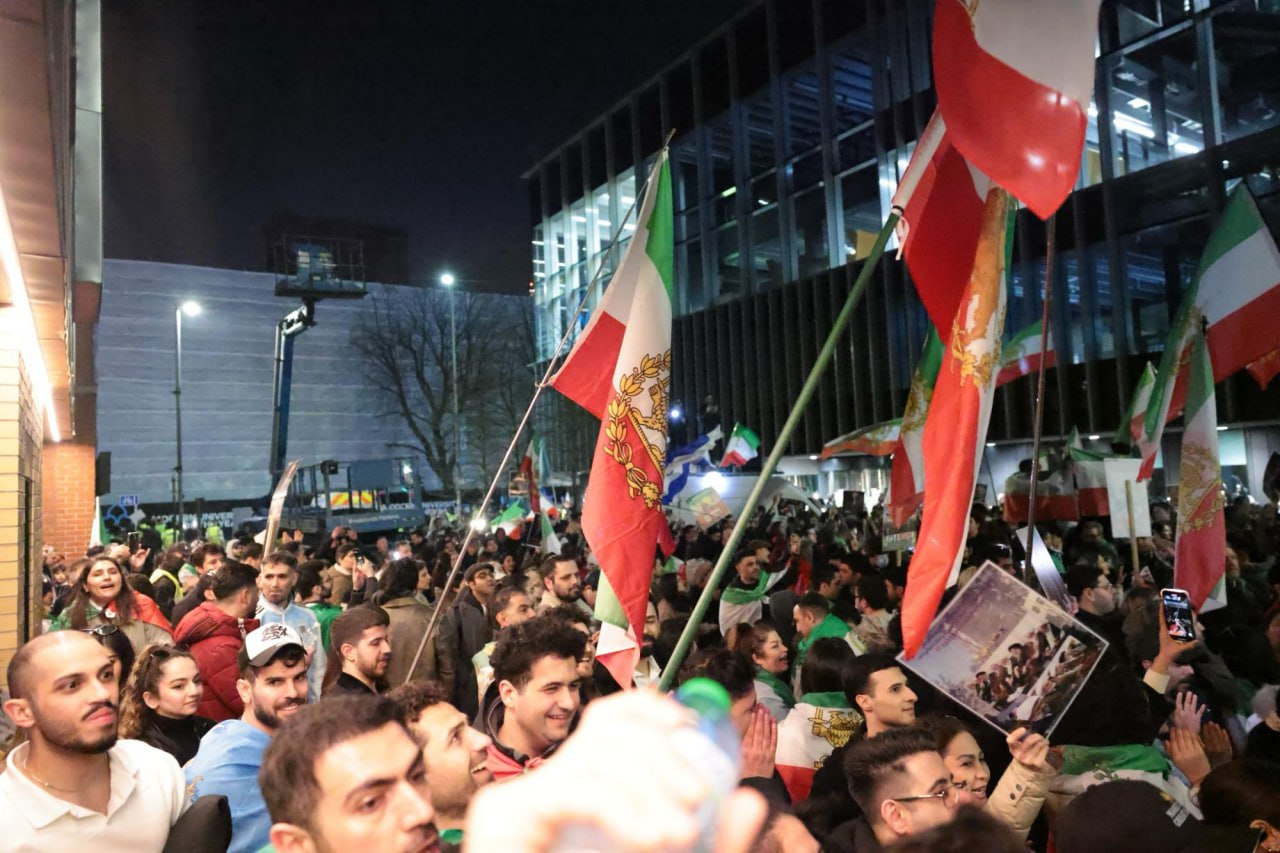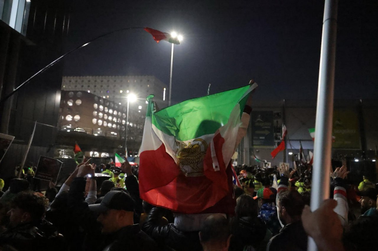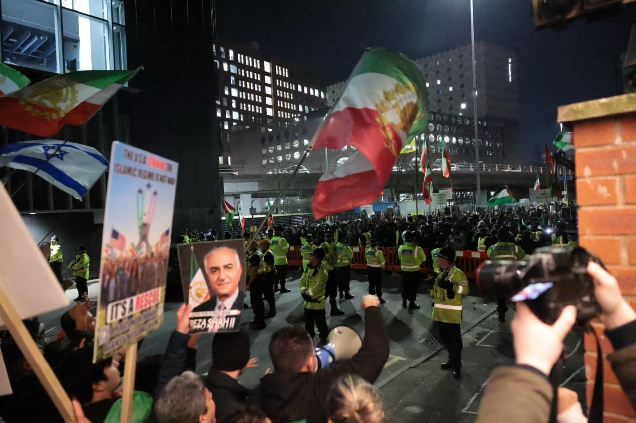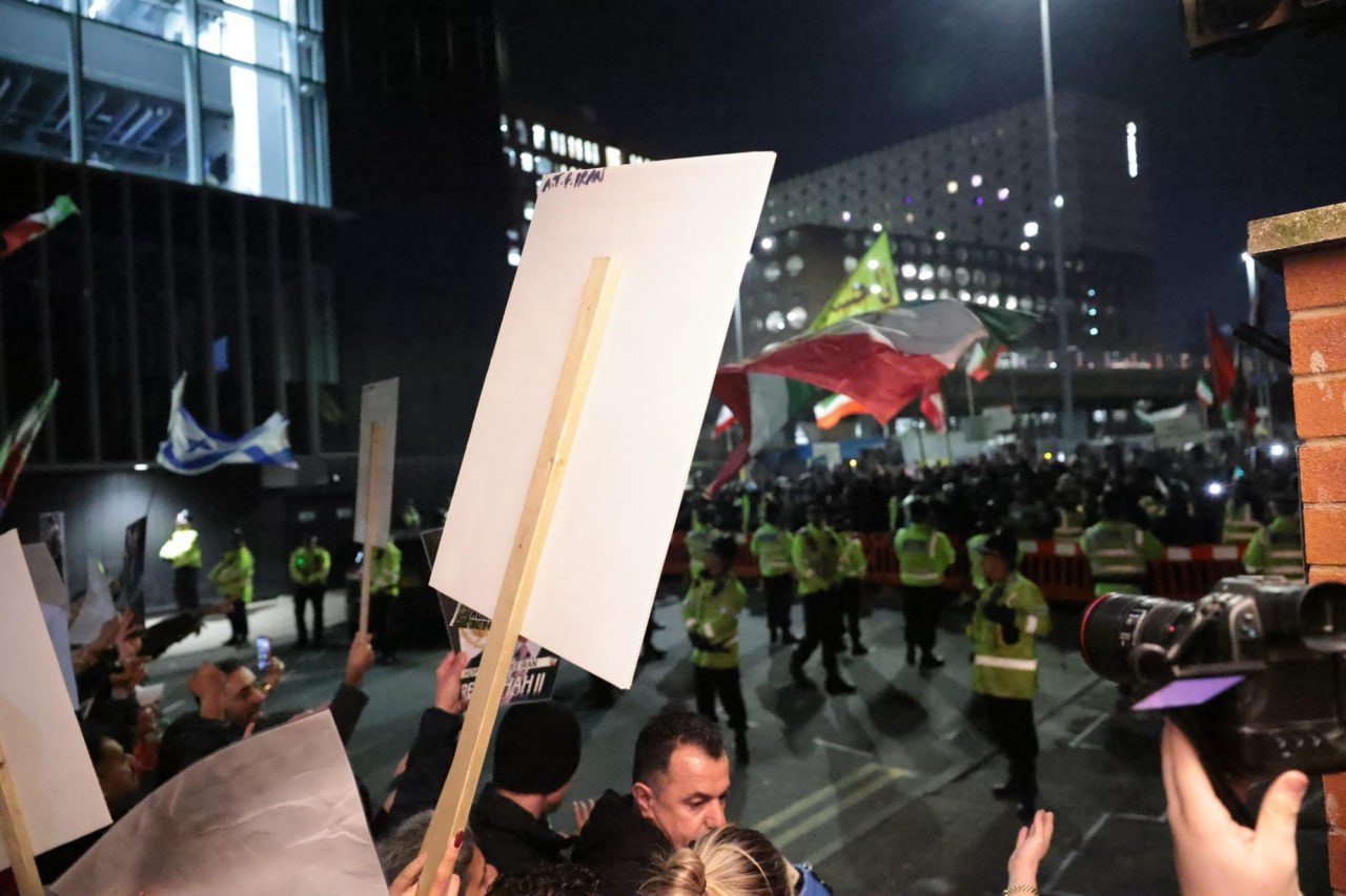 В ответ на это развернулась контрпротестная акция. Ее участники включали громкую музыку, скандировали лозунги и танцевали. Они размахивали флагами США, Израиля и дореволюционного Ирана, били в барабаны и выкрикивали угрозы в мегафоны в сторону оппонентов. Две группы разделяли десятки полицейских.