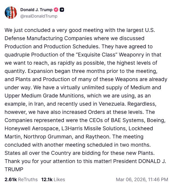 Мы только что завершили очень продуктивную встречу с крупнейшими американскими оборонными предприятиями, на которой обсудили производство и графики производства. Они согласились в четыре раза увеличить производство оружия «высочайшего класса», поскольку мы хотим как можно быстрее достичь максимального объема производства. Расширение производства началось за три месяца до встречи, и многие заводы и производство многих видов этого оружия уже запущены. У нас есть практически неограниченный запас боеприпасов среднего и выше среднего класса, которые мы используем, например, в Иране, а недавно использовали в Венесуэле. Тем не менее, мы также увеличили заказы на эти виды вооружений. На встрече присутствовали генеральные директора компаний BAE Systems, Boeing, Honeywell Aerospace, L3Harris Missile Solutions, Lockheed Martin, Northrop Grumman и Raytheon. Встреча завершилась назначением следующей встречи через два месяца. Штаты по всей стране участвуют в тендере на строительство этих новых заводов.