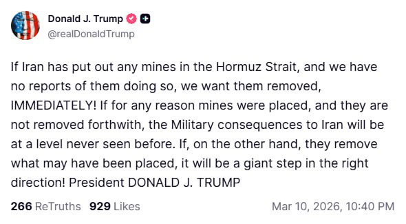 Если Иран установил какие-либо мины в Ормузском проливе, а у нас пока нет сообщений об этом, мы требуем их немедленного обезвреживания! Если по какой-либо причине мины были установлены и не будут немедленно обезврежены, военные последствия для Ирана будут беспрецедентными. Если же, с другой стороны, они обезвредят то, что, возможно, было установлено, это будет огромным шагом в правильном направлении!